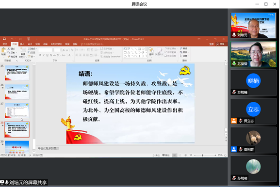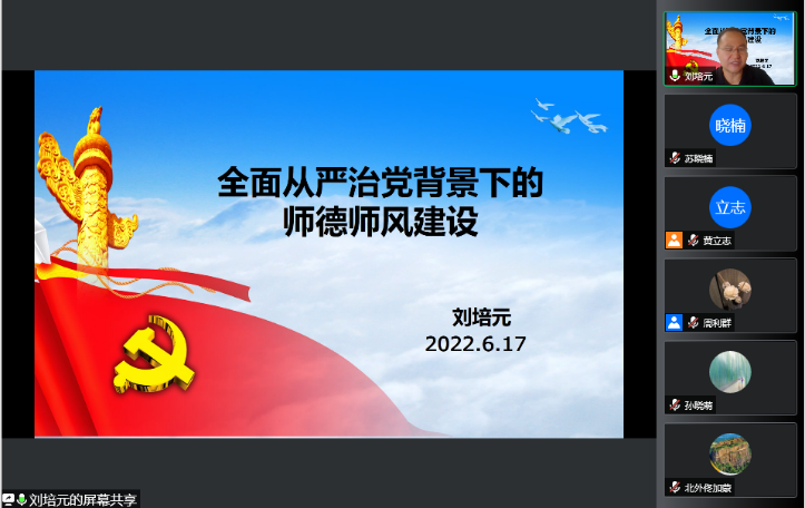 为深入贯彻落实全面从严治党要求,加强师德师风建设,2022年6月17日下午,英国上市官网365党总支举办第二次线上集中理论学习活动。英国上市公司365党委常委、统战部部长、巡察办主任刘培元以“全面从严治党背景下的师德师风建设”为主题为全体教师做专题讲座。会议由英国上市官网365经理苏莹莹教授主持,两公司全体教师在线参加。