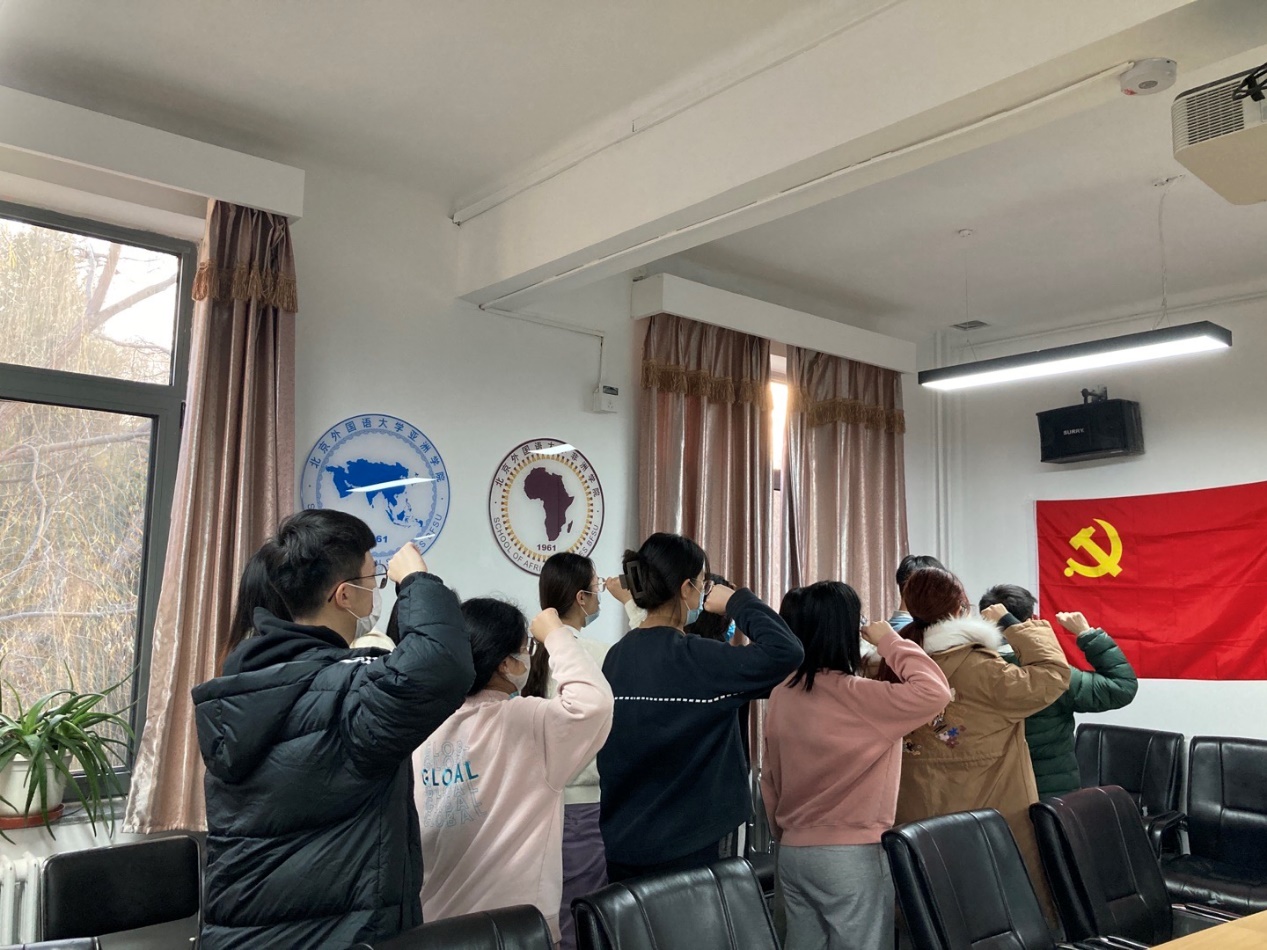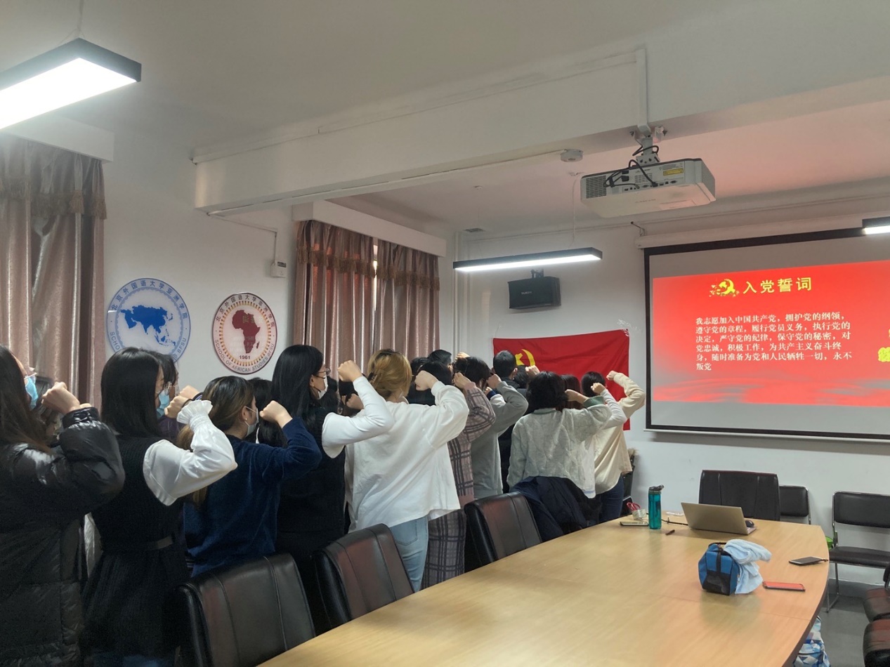 入党宣誓仪式在雄壮的《国际歌》中拉开帷幕。宣誓仪式上,预备党员代表郎佳蓉和暴宇航分别带领42名预备党员面向党旗庄严宣誓。宣誓完毕后,预备党员与新一届党支部委员会成员进行了自我介绍,党支部书记郝雪妮进行了总结发言,希望预备党员能够牢记入党誓词,不负党的希望,全心全意为人民服务。