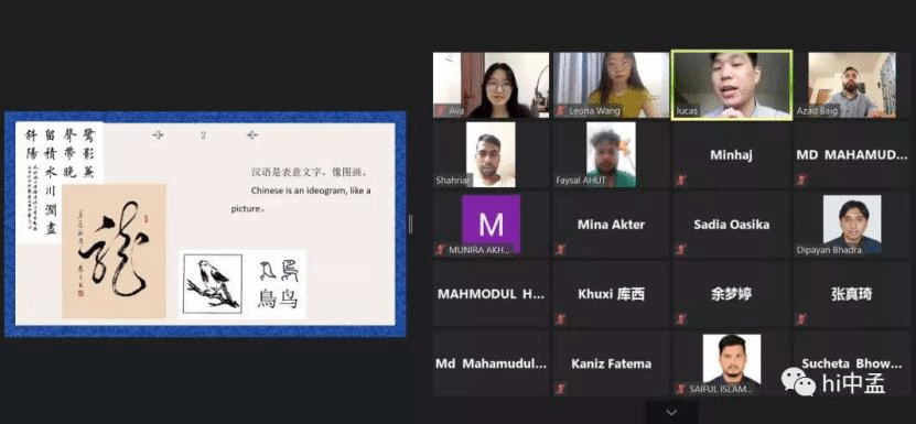 根据调研的结果,每场讲座分为两部分,一部分是汉字学习方法,另一部分是中国文化知识。讲座中,两位老师介绍了中国的各类文化现象,如大熊猫、中国省市区划、十二生肖、春节、中国八大菜系和人工智能等,在汉语学习方面讲解了拼音、声调、汉字、古汉字等,推荐了中国有名的新闻网站以及汉语教学机构孔子公司等高效的线上汉语学习资源,还通过对话的方式带领参会者练习了中文沟通,每场讲座最后还准备了问答环节来解决孟加拉国朋友们的困惑。在讲座中,小组成员还利用孟加拉语专业知识,对一些知识点进行了孟加拉语-汉语讲解。爱琳老师还结合自己在英国孔院的工作经历,和参会者讨论了中文、英文、孟加拉语交流用语上的差异,这些都凸显了讲座跨文化交流的特色。