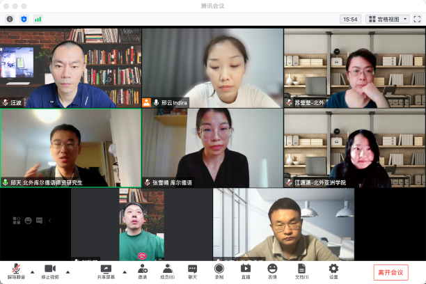 北京大学李睿恒老师长期从事库尔德问题研究,他结合自己学习和工作实际,从学习难度差异、学术发展定位、对象国语言政策等方面对库尔德语专业教学和研究工作提出建设性意见。北外阿拉伯语公司经理刘欣路结合前期调研中国驻叙利亚、伊拉克、土耳其等使馆外交官所了解到的相关情况,提出语种专业建设应契合国家外交工作开展的明确意见。汪波副经理强调两位团队研究生不能放松两门语言的学习和研究,现阶段首先开始索拉尼语教材建设的筹备工作。