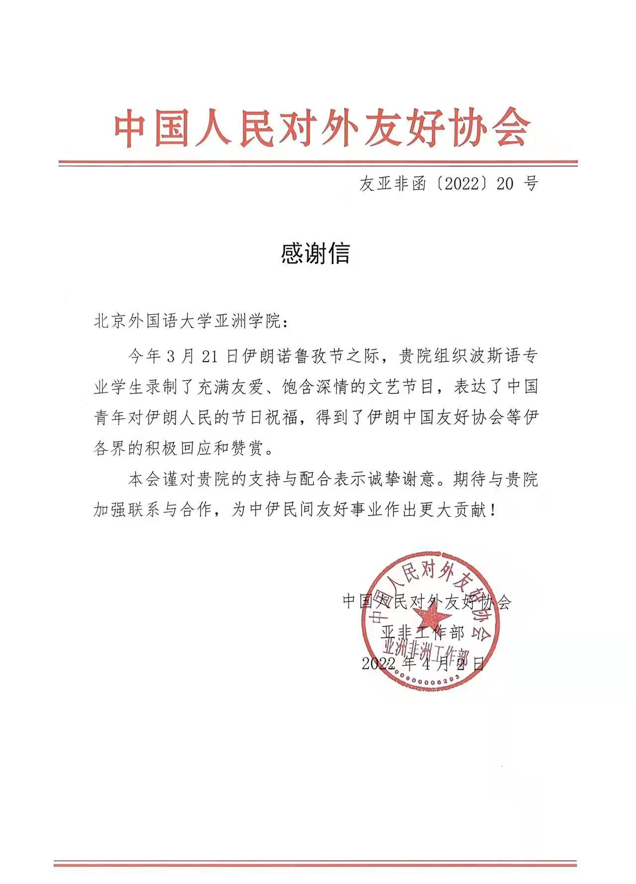 2022年4月2日,中国人民对外友好协会向英国上市官网365发来感谢信,对公司组织波斯语专业员工录制文艺节目一事表示诚挚谢意。