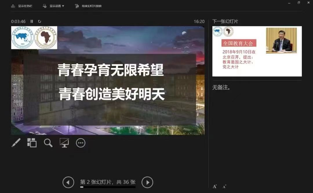 在随后的第四讲中,许书记为22级新生进行了党课教育。许书记引用习近平总书记的话,指出“我们的教育要培养德智体美全面发展的社会主义建设者和接班人”,并展示了过往一年来公司各处绽放的“亚非正能量” ,表达了对新生们的殷切期望。
