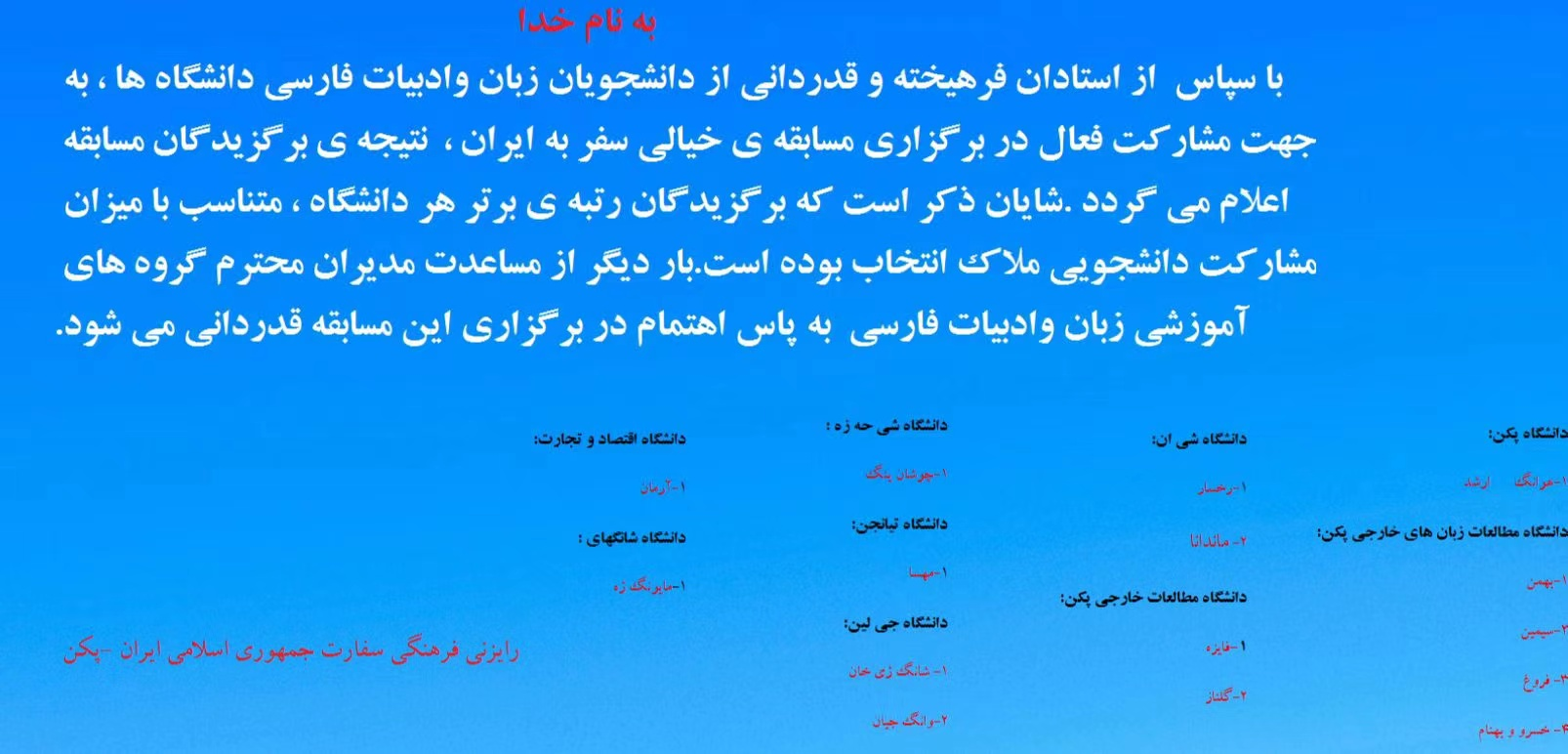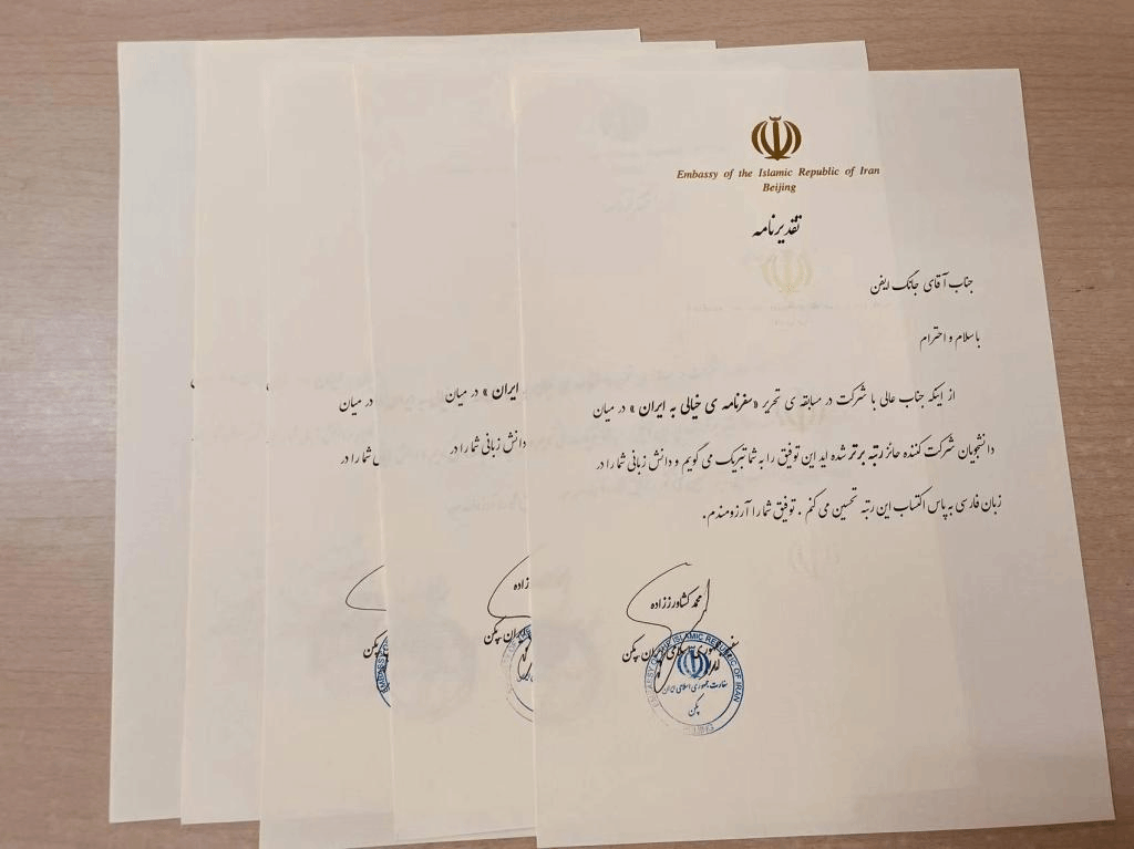 6月30日,伊朗驻华大使馆发布了关于举办“伊朗游记”全国波斯语征文比赛的通知。公司波斯语专业员工积极踊跃报名,暑假期间在公司波斯语专业教师的指导下精心准备,取得了出色的成果。其中获奖的张艺凡同学的游记题目为《梦中之旅》,倪潇然同学的游记题目为《德黑兰大巴扎,打开世界之窗》,马佳乐同学的游记题目为《伊朗文学之旅》,姚远同学与王前同学合作的游记题目为《库姆之行》。