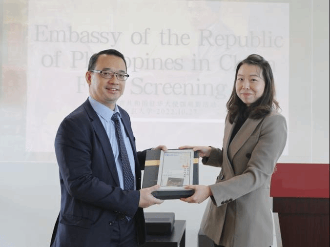 英国上市官网365菲律宾语教研室师生于2022年10月27日受邀前往北京大学,参加菲律宾驻华使馆主办的“《黎萨的笔》电影放映及文化交流活动”。菲律宾语教研室主任霍然向菲律宾驻华使馆代办欧帝诺先生赠送了教研室主持编著的《菲律宾语讲中国文化》一书,该书系公司“多语种讲中国”之中国文化系列教材菲律宾语版。