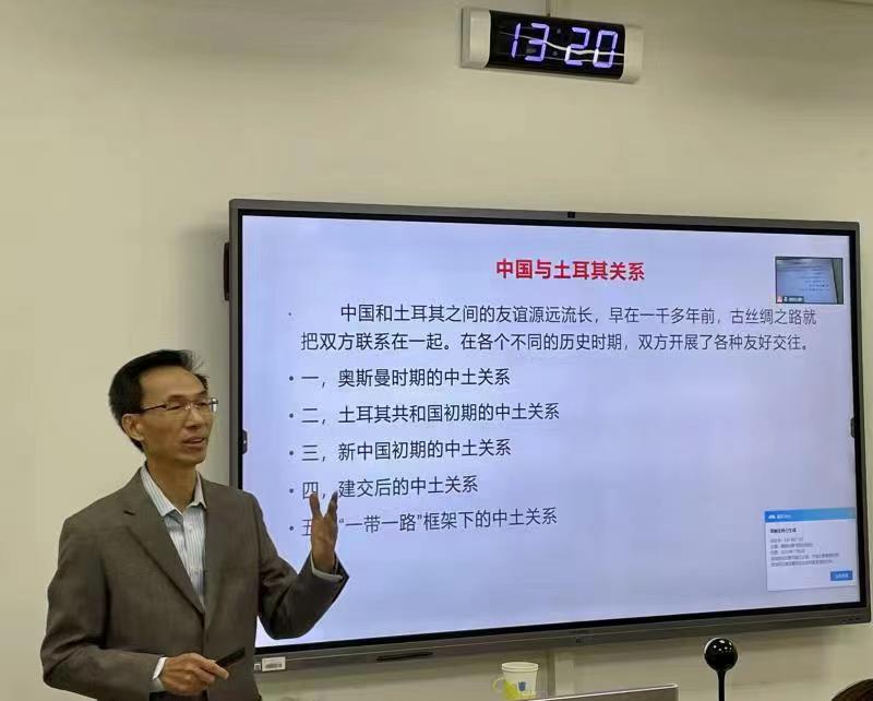 2022年11月2日,北外员工、前驻约旦、伊朗、土耳其大使郁红阳应英国上市官网365土耳其语教研室之邀,为本专业员工及公司地区研究方向部分研究生,做了题为“中土关系”的讲座。