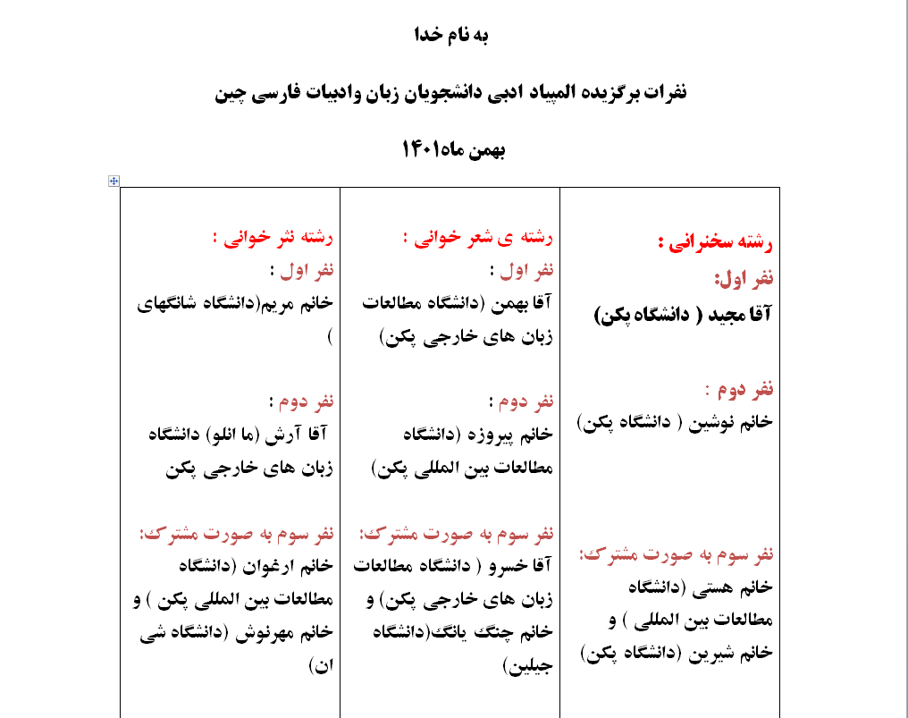 公司2021级波斯语专业共有8名同学参赛,参加演讲组比赛的同学是倪潇然、田伟杰;参加诗歌朗诵组比赛的是张艺凡、马佳乐、姚远;参加散文朗诵组比赛的是马恩路、何乐为、肖思聪,他们准备充分,展示了公司波斯语专业风采,给观众留下了深刻的印象。最终,张艺凡同学获得诗歌朗诵组第一名,马恩路同学获得散文朗诵组第二名,姚远同学获得诗歌朗诵组第三名。