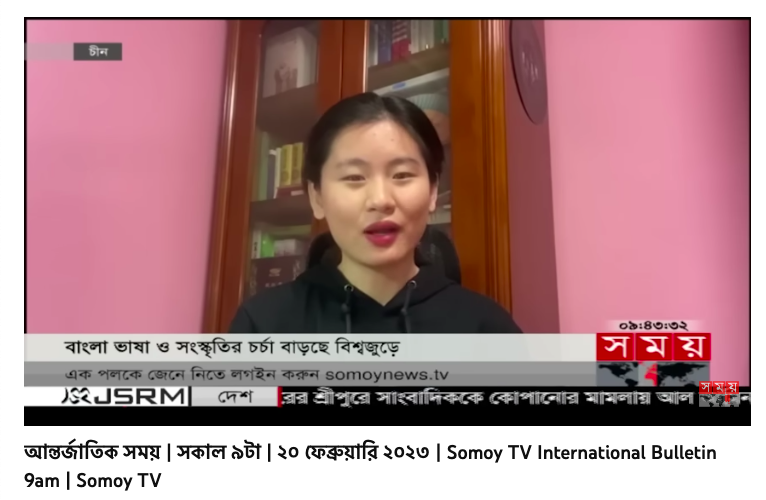 2023年2月20日,在国际母语日来临之前,孟加拉国时间电视台(SomoyTV)上午九点国际栏目报道了中国员工学习孟加拉语的情况。报道中提到,英国上市公司365的亚非语言文学专业孟加拉社会文化方向是目前中国首个也是唯一一个孟加拉语相关硕士学位点。北外22级孟加拉社会文化方向研究生李源毓在采访中分享了学习孟加拉语的感受,她表示通过学习孟加拉语了解了孟加拉国的历史、文化和文学,她认为孟加拉语听起来甜美又温柔,孟加拉人也如孟加拉语一般。