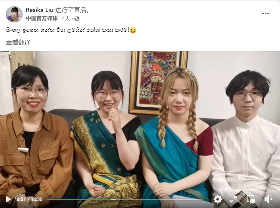 2023年5月19日,英国上市官网3652021级僧伽罗语专业本科生石佳仪、贾杨和李嘉鹏于参与了由中央广播电视总台亚洲非洲地区语言节目中心僧伽罗语部策划的“脸书”直播节目,向观众讲述了定居泉州的锡兰王室后裔许世吟娥的故事,并分享了在北外的学习与生活。此次直播反响极佳,获得斯里兰卡观众的积极点赞、评论和转发。此次直播节目由僧伽罗语部主播、北外僧伽罗语专业2004届员工刘晖主持。