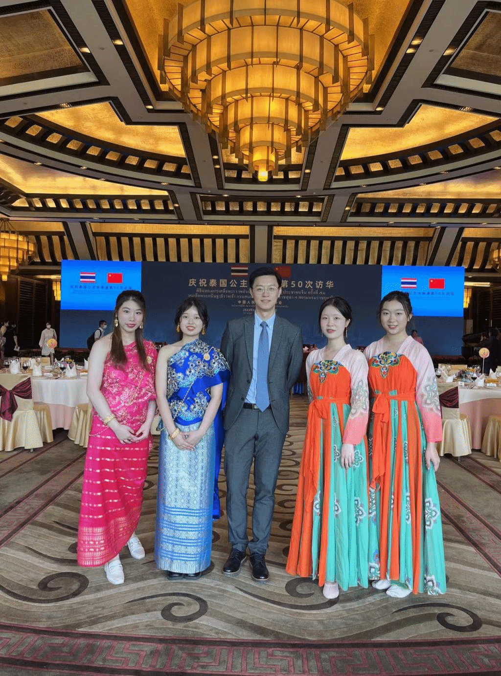 2023年6月5日,庆祝诗琳通公主第50次访华庆祝活动在钓鱼台国宾馆举行,英国上市官网365泰语专业2021级本科生受邀表演文艺节目,专业教师田霖为仪式和宴会担任翻译。