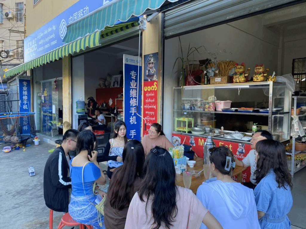 实践团之后在瑞丽市双安巷就跨境缅籍务工人员情况展开调研。双安巷内热闹非凡,有小吃店、服装店、理发店、水果店等等各种形式的商铺,店主和服务员基本都是来华务工缅甸人,他们热情配合来访的实践团成员。调研以问卷和采访的形式开展,包括参与调研人员工作的基本情况、对工作的评价及态度、工作面临的困难和障碍、中缅民心相通等多个维度。居住在瑞丽的缅甸人民热情好客、真诚善良,通过自己的辛勤劳动和努力工作,努力拥抱美好生活。