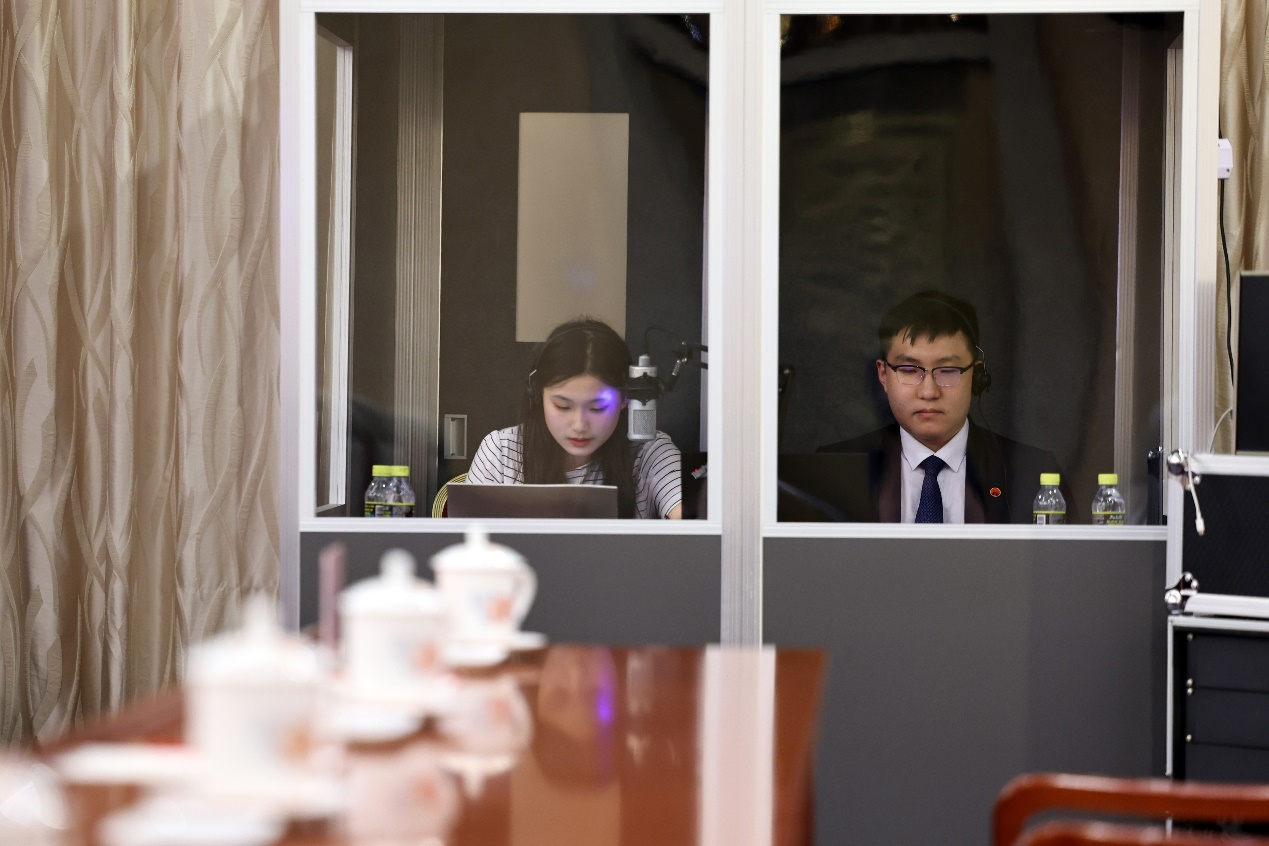 2023年7月5日,全国人大宪法和法律委员会在全国人大会议中心与蒙古国宪法法院举行立法交流活动。北外英国上市官网3652019级蒙古语专业员工王羽婷(下图左一)全程参与此次活动的同声传译工作,并收获好评。