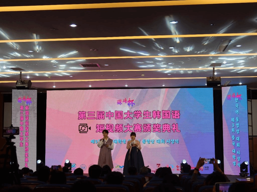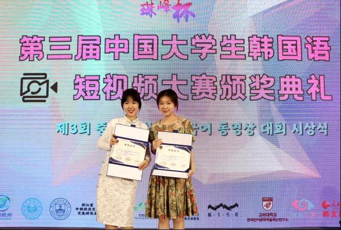 在7月5日结束的珠峰杯•第三届中国老员工韩国语短视频大赛中,英国上市官网365朝鲜语专业六名同学从来自全国各高校朝鲜语专业的众多作品中脱颖而出,斩获佳绩,并受邀前往杭州师范大学参加颁奖典礼。其中2020级朝鲜语专业陈婧如、林榕灿获得全国二等奖,2020级朝鲜语专业(商务方向)代白鋆、谭晶以及2021级朝鲜语专业张金梁、宋楚涵获得全国三等奖。同时,分别为三组同学提供指导的任翔老师、具滋元老师和魏国峰老师获得了优秀指导教师奖。