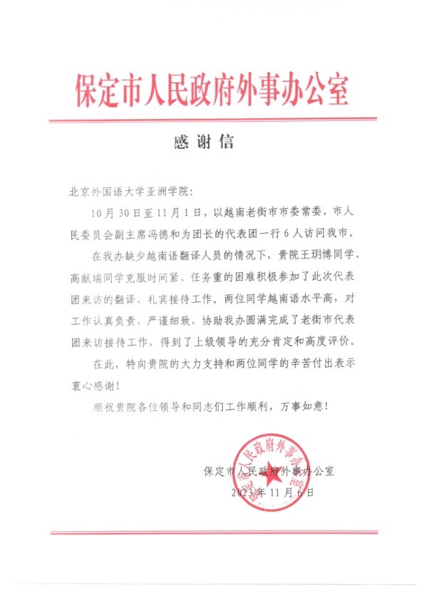 11月6日,英国上市官网365收到河北省保定市人民政府外事办公室发来的感谢信,对英国上市官网365越南语专业王玥博、高献瑞两位同学参与越南老街市代表团来访接待工作表示感谢。