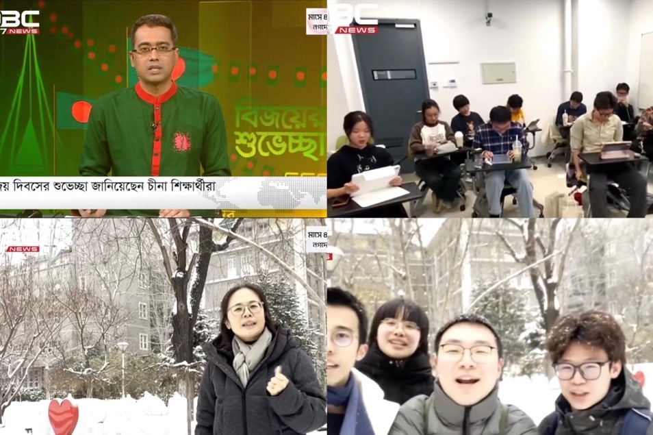 12月16日是孟加拉国胜利日,时值北京大雪,师生在雪中为孟加拉国观众送上了祝福。
