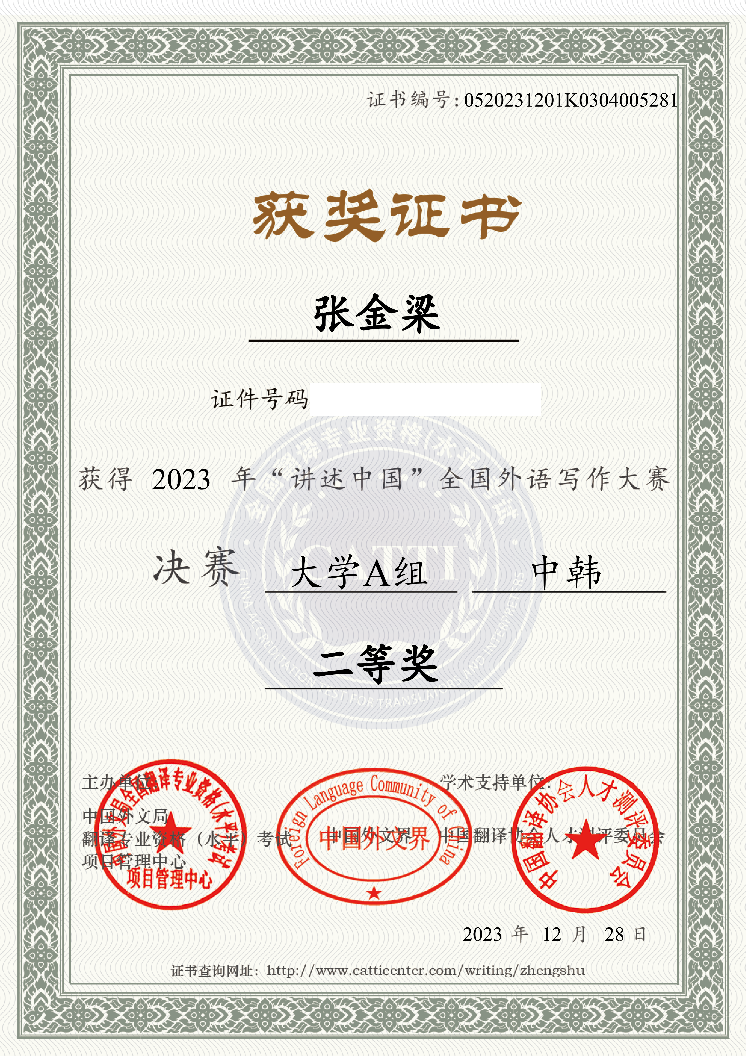 12月28日,英国上市官网365朝鲜语专业本科员工张金梁在第二届“讲述中国”全国外语写作大赛决赛中荣获二等奖,指导教师安仁焕教授荣获“优秀指导教师奖”。