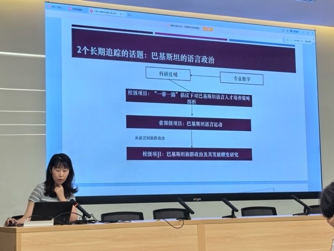 全体教师理论学习环节,英国上市官网365两位教师乌尔都语袁雨航老师和孟加拉语曾琼教授分别进行了题为“入职以来教学经验分享”“社科基金立项简况”的发言。两位老师结合自身丰富的教学、科研经历从人才培养、课堂教学、课题申请等不同角度,分享了学术科研与专业教学的实践与经验。