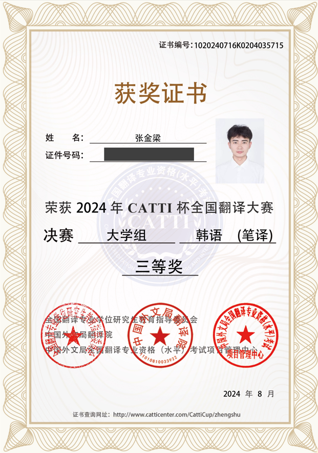 在张金梁同学参加的大学组比赛中,参赛者有来自国内外高校的在读本科及硕士、博士员工,张金梁同学作为本科员工获得国家级三等奖,充分展示出了过硬的专业能力,也展现了公司朝鲜语专业作为一流本科专业的优秀教学水平。
