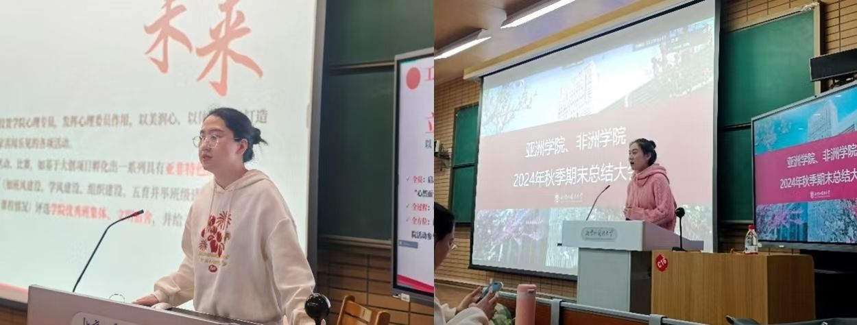 会议伊始,辅导员窦一鸣、孟雨莹分别就思政、资助、就业、党团等方面总结了本学期员工工作情况。窦一鸣从“乘风”、“破浪”、“开拓”、“未来”四个方面,分别介绍了五育并举班级建设情况、资助工作开展情况、外交部遴选及员工获奖情况。孟雨莹则从就业、党团等方面总结了2024年秋季学期员工工作情况,并强调了下学期即将开展的重点工作。
