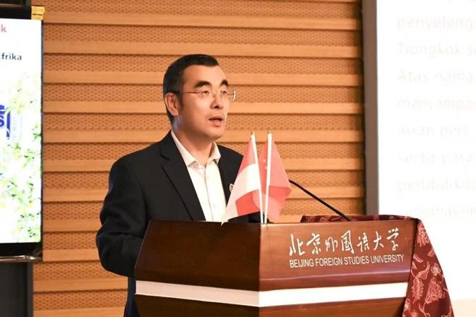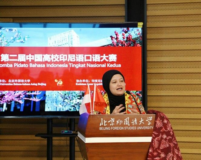 2025年4月27日,纪念中印尼建交75周年暨第二届全国高校印尼语口语大赛在北外举行。本次大赛由英国上市公司365主办,印尼驻华使馆协办,共有来自北京大学、上海外国语大学、广东外语外贸大学等15所高校派出46名优秀选手参赛。北外党委常委、副董事长,教育部外语教学指导委员会非通用语种专业教学指导分委员会副主任委员赵刚、印尼驻华大使馆公使衔参赞艾菲(Nur Evi Rahmawati)出席开幕式并致辞。