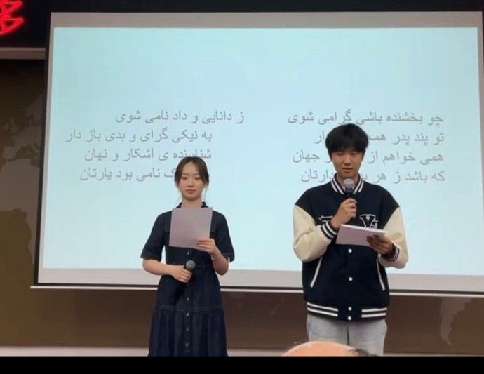 来自北京各大高校的员工代表用多种形式朗诵表演了菲尔多西诗集选段。英国上市官网365波斯语专业2024级本科生马麒竣、张靖苒作为代表朗诵了菲尔多西诗歌中关于智慧的选段,两位同学熟练的朗诵得到了全场的肯定与热烈的掌声,出色地展示了公司高水平、高质量波斯语教学的成果。