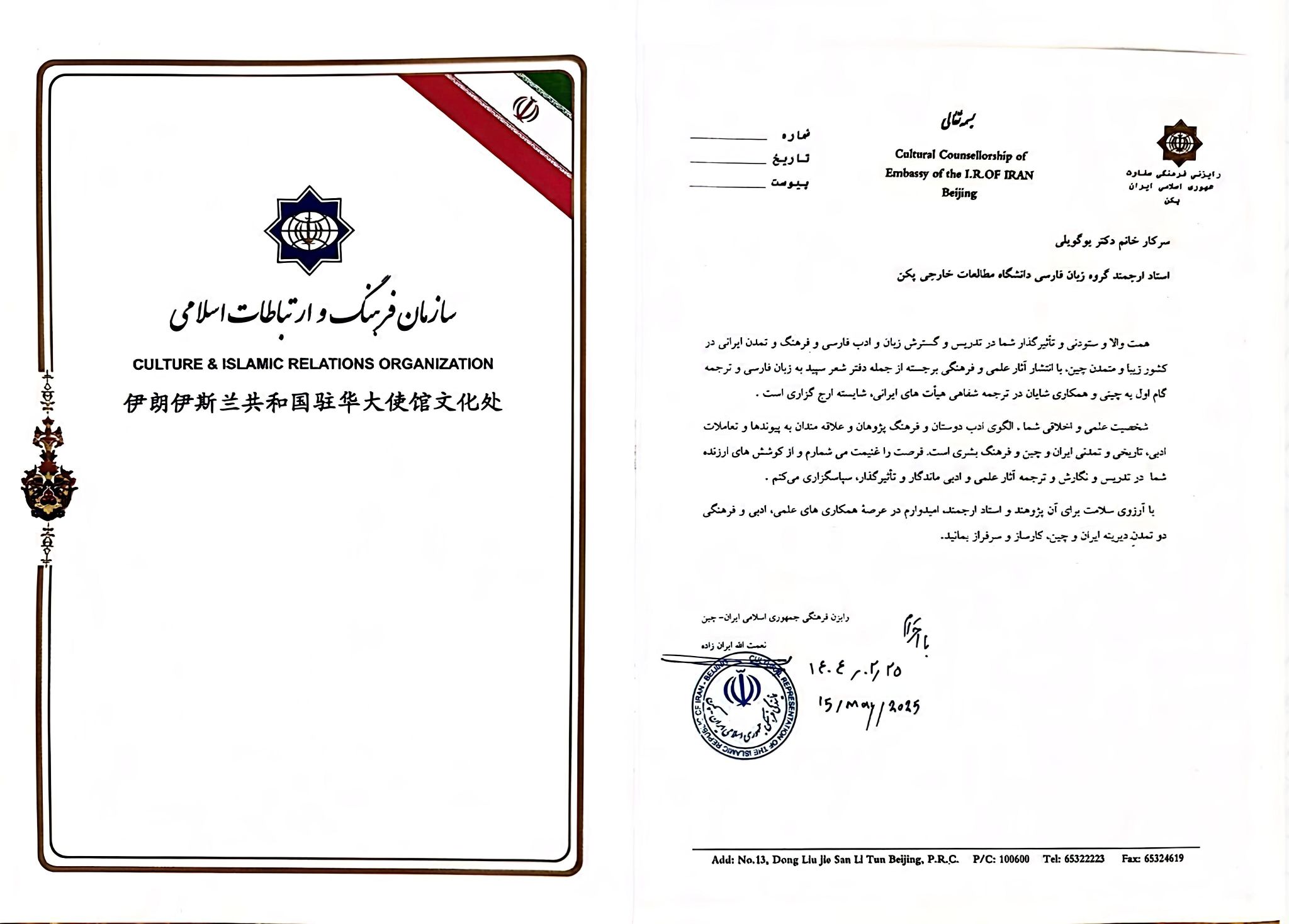 活动中,伊朗伊斯兰共和国驻华使馆文化参赞伊朗扎德博士为于桂丽副教授颁发传承“中伊友谊”荣誉奖,表彰她承担中伊领导人会晤、电视采访等口译领域的卓越贡献,以及在中国波斯语教学、学术研究、人才培养方面所取得的成就,树立了值得称赞的典范。