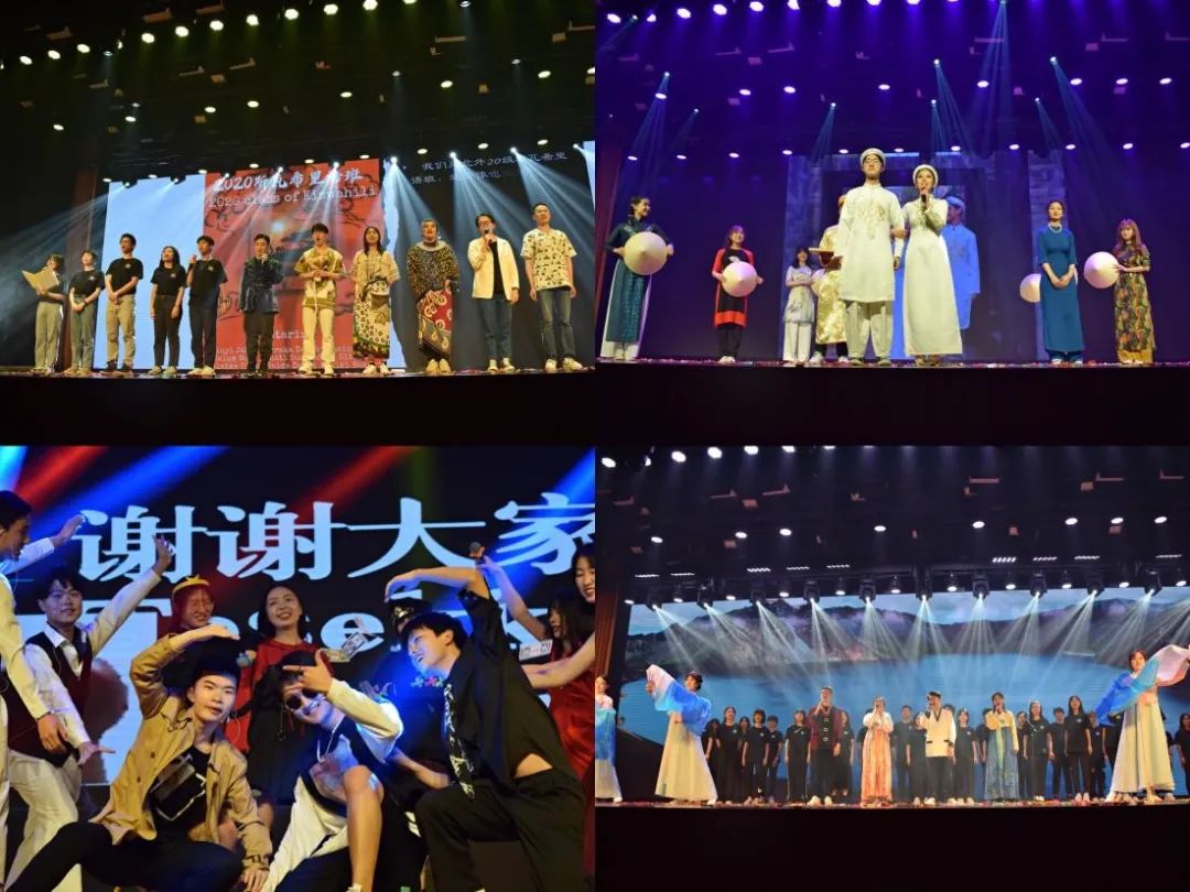 晚会在流浪者乐队高昂的乐声中拉开帷幕。晚会主题视频《无涯》在大屏幕放映,随后的民族服饰走秀环节中,同学们身着亚非各语种对象国的特色民族服饰和中国各朝代的精美民族服饰,中外文化的绚烂多姿交相辉映,引起场内掌声不断。