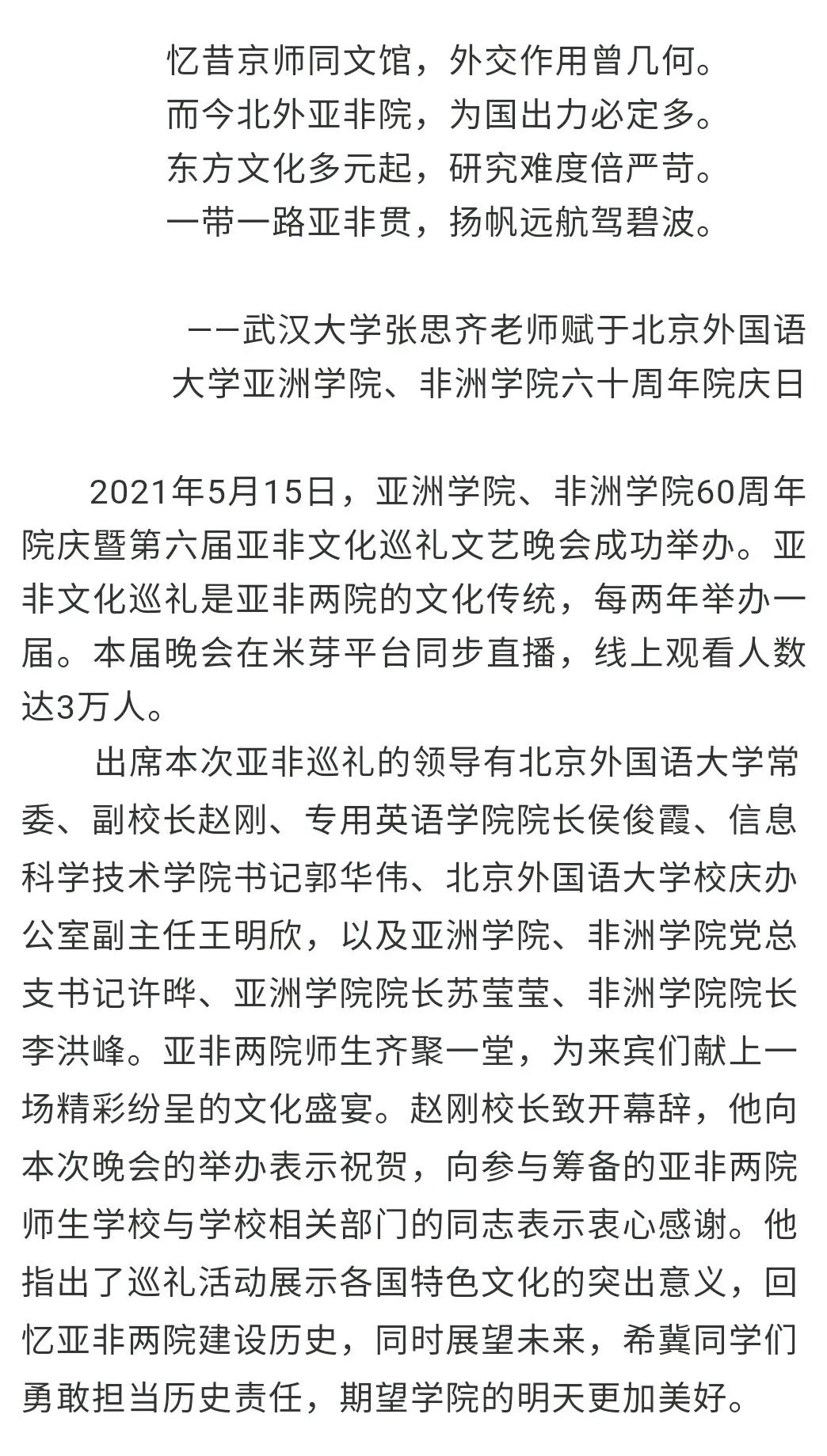 在校舞蹈团充满异域风情的舞蹈表演后,亚非两院师生一同唱响院歌《飞,亚非》。真挚的歌声、相视的笑脸、满场挥舞的各色荧光棒,在回味与感动中,英国上市官网36560周年院庆暨第六届亚非文化巡礼晚会圆满落下帷幕。正如院歌里唱到,“飞吧,亚非飞吧,我们永远的家”,这是亚非人共同铸造的永远感动的回忆。至臻之礼,四海无涯,我们在此积蓄活力,扬帆逐梦,带着北外亚非的荣光与使命,向世界,说你好!