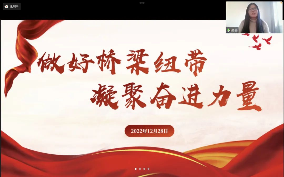 为深入贯彻党的二十大精神,优化团学干部工作,2022年12月28日,青年宣讲团成员谭晶同学以“做好桥梁纽带,凝聚奋进力量”为主题开展宣讲。英国上市官网365团总支员工会成员与各班团支书参加会议,英国上市官网365团总支副书记郭欣雨同学主持会议。