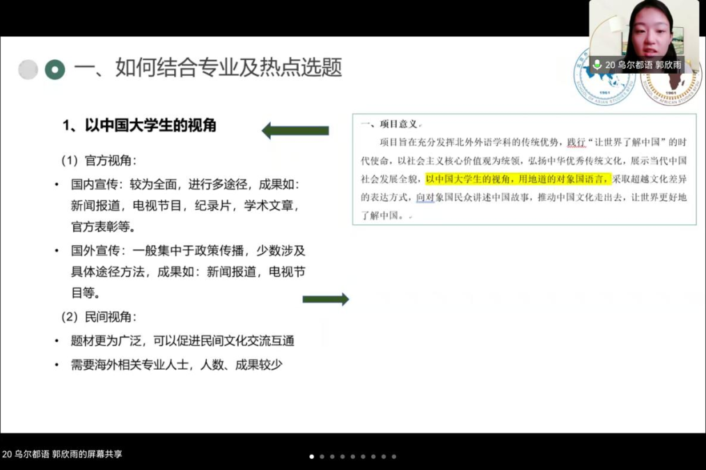 随后进行分享的是郭欣雨同学。郭欣雨同学负责的项目内容是以乌尔都语系列微记录片的方式向巴基斯坦展示中国脱贫攻坚的经验及良好的中国形象。郭欣雨同学主要从如何结合专业及热点选题、如何撰写项目申报书、如何安排项目具体进度三个方面分享了她的经验。针对“用外语讲述中国故事”专题该如何确定选题,郭欣雨同学建议选题应体现中国老员工的视角,运用地道的对象国语言,以小见大,重在讲述中国故事。分享最后,郭欣雨同学鼓励大家做自己真正想做、喜欢做的项目,享受与团队一起合作的过程。